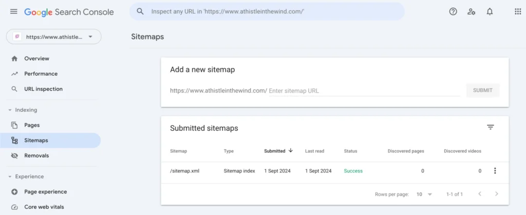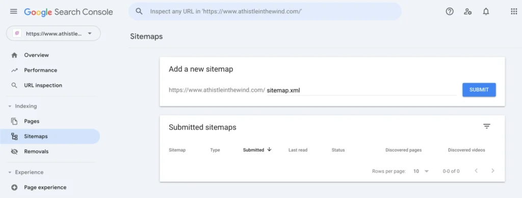 Now, once you’re in “Sitemaps,” add the last part of your sitemap URL to the “Add a new sitemap” section. Since my sitemap URL is “https://www.athistleinthewind.com/sitemap.xml,” I went in and added “sitemap.xml.”