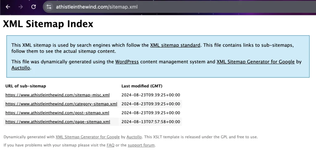 The quickest way to find your website’s sitemap is through a manual check. Simply type the following address on your browser: “https://yoursite.com/sitemap.xml,” where you should add your site’s domain name in place of “your site.” For my website, for example, I typed in “https://www.athistleinthewind.com/sitemap.xml.”